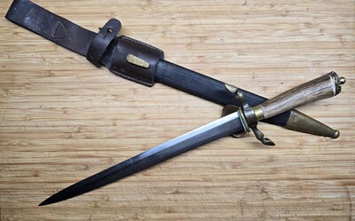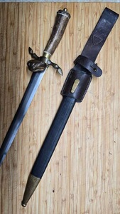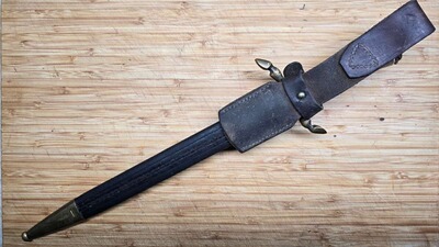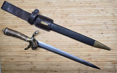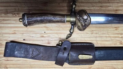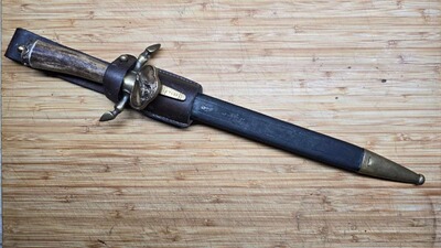 Alter Hirschfänger/Jagddolch mit Lederscheide und braune Koppelschuh.