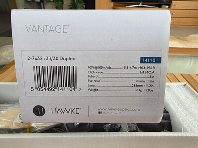 Verkaufe hier ein Hawke Zielfernrohr Vantage 2-7x32 mit 30/30 Duplex Absehen und 1 Inch Rohrdurchmesser.
