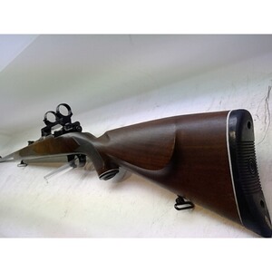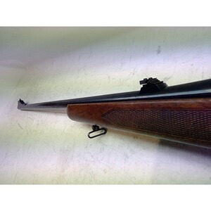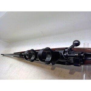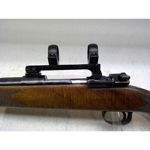 Rep.Bü. Frankonia Mod 98 in .30-06Sp. Lauflänge ca. 58cm, Gesamtlänge ca. 113cm, Schaftlänge ca. 35,5cm. Timney Abzug, Brückenschwenkmontage 30mm Ringe. Flügelsicherung, Holzschaft, offene Visierung.