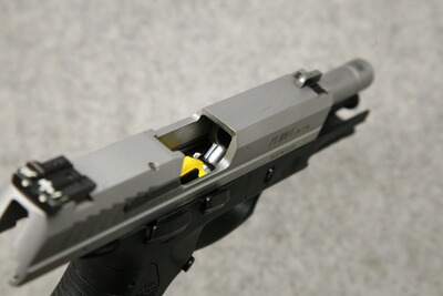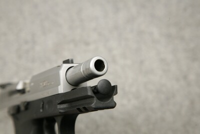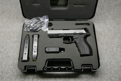 Kaliber 9 mm Luger. Lauf 104 mm, Stahlverschluß, Kunststoffgriffstück, Magazin für 17 Patronen, verstellbare 3-Dot Visierung, Double-Action/Single-Action Abzug, Entspannhebel/Sicherung. Ersatzmagazin, Koffer. Gesamtlänge 210 mm, Gewicht 856 g.