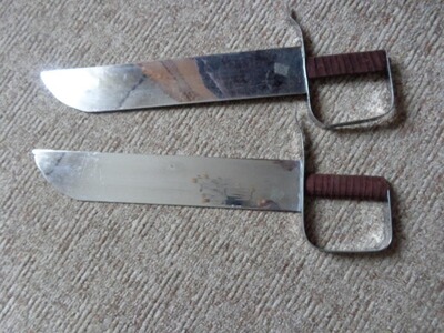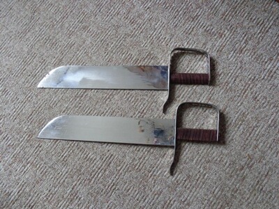 Im Rahmen einer vielfältigen Militaria Sammlungs Auflösung sind auch alte Replikate/Nachbildungen von Blankwaffen, "exotischen Kampfartikeln" sowie Kampfartikel aus vergangenen Epochen vorhanden. Hieraus biete ich diese Kurzschwert Replikate für Training oder Schaukämpfe. Sie sind für beidhändige Verwendung konzipiert, sind je 49 cm lang, die Klinge verchromt 38 cm lang und 7 cm breit. Über Kreuz an der Wand dekorativ.