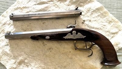 Verkaufe aus einen Nachlass eine gebrauchte Le Page Target Standard Perkussion Pistole von Petersoli mit zwei Läufe Kal. 31 & 44