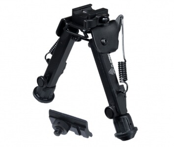 Das Zweibein kann mit einem dualen Montagedesign entweder direkt an einer Picatinny-Schiene oder über einen Riemenbügelösen-Adapter montiert werden. Ein Schnellspannverschluss ermöglicht eine werkzeuglose Montage und Demontage. Die Beine sind fünffach verstellbar und mit einer Klemmverriegelung ausgestattet, was präzise Anpassungen erlaubt. Gummierte Standfüße sorgen für sicheren Halt auf verschiedenen Untergründen. Die Beine lassen sich nach vorne schwenken und zusammenklappen, was den Transport erleichtert.