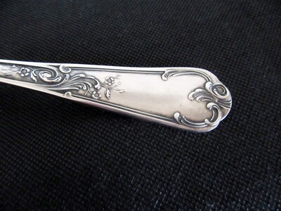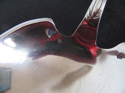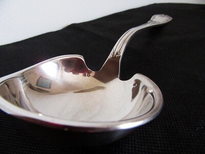 Die mittlere Schöpfkelle gehört zum Anrichtbesteck und hat eine größere oder breitere Schüssel / Laffe als die kleine Schöpfkelle, um eine größere Menge an Soße, wie z.B. Hollandaise oder Béarnaise, aufzunehmen. Auch bekannt als Schöpfkelle für Sahnesaucen, die vor allem in der gehobenen französischen Küche Verwendung findet. Die Herstellerpunze deutet auf die Orfevrerie Raoul Hureau hin, die um 1910 tätig war.