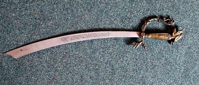 Angeboten wird ein sehr schönes Metall-Replikat eines Mittelalter-Krummsäbels, 70cm lang, mit schön verziertem Griff