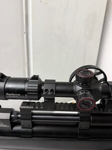 - Eine zweite Picatinny-Schiene oben mit einem erhöhten Zielfernrohr, es handelt sich hier um ein hochwertiges West Hunter mit Absehen 4x16x44