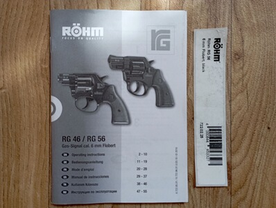 Deckplatte, Abschussbecher, Gebrauchsanleitung und Kofferaufkleber für Schreckschuss-Revolver Röhm RG 56 Kal. 6 mm Flobert K.