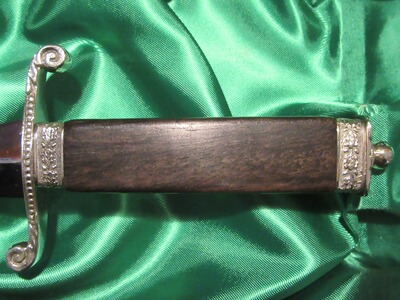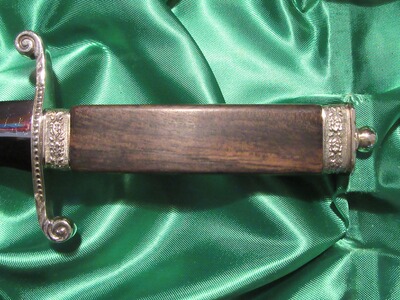 Griff aus hochwertigem Holz, Handschutz und Knauf mit Eichenlaub-Muster aus Neusilber.