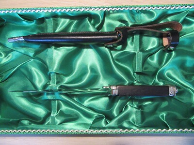 Hochwertige und sehr robuste schwarze Echtlederscheide mit Edelstahlelementen.