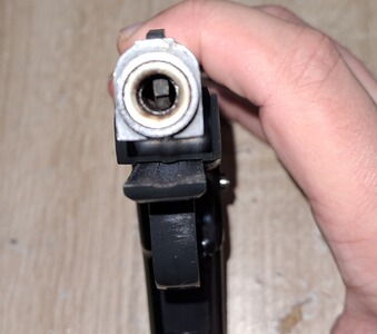 Die Waffe eignet sich evtl. auch zur SV. Die Laufsperre liegt weit hinten und ist ohne Licht kaum zu sehen. Sie ist im alten PTB 387, das Jahr ist wohl 1991 (Beschuss KB).