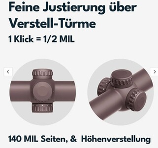 Zu den bemerkenswertesten Eigenschaften dieses Zielfernrohrs gehören das beleuchtete Absehen mit 6 Stufen welches der Umgebungshelligkeit angepasst werden kann um das Ziel schnell zu erfassen und die feine Verstellung in 1/10MIL Schritten. Dies ermöglicht eine bessere Sichtbarkeit des Absehens bei schlechten Lichtverhältnissen oder in der Dämmerung und eine feine Anpassung der Zielgenauigkeit um das Zielfernrohr optimal in Ihre individuellen Bedürfnisse und Schießbedingungen anzupassen.