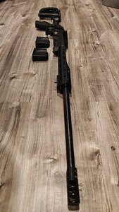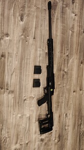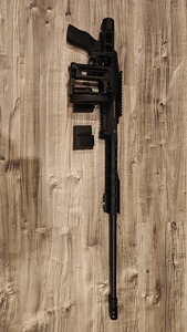 Die Waffe ist verbaut in einem Akila Aluminium-Chassis, welches eine moderne Ergonomie und hohe Stabilität bietet. Die Schulterstütze ist zum leichteren Transport einklappbar. Zusätzlich ist eine PGW Mündungsbremse montiert, die den Rückstoß deutlich reduziert.