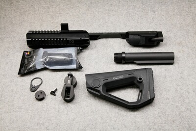 Umrüstsatz Triarii RTU (= Ready to use), BLK (= black / schwarz) für Glock Pistolen 19 / 23 / 32 der Geneneration 4 (Gen4). Vollmetallkonstuktion. Picatinny-Montageschienen am Vorderschaft. Mit Buffer-Tube, Hinterschaft und Vordergriff.