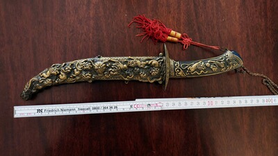 Dieser Artikel ist ein REPLIKA Chinesischer Zeremonial-Dolch, der als Dekorationsobjekt dient. Das Design ist inspiriert von traditionellen chinesischen Motiven, insbesondere dem Löwenhund, einer symbolträchtigen Figur in der chinesischen Kultur.