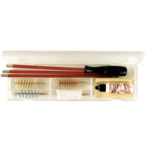 Reinigungsgarnitur für Bockbüchsflinten und Drillinge bestehend aus einem 3-teiligen Stahlputzstock mit PVC-Umkleidung und drehbarem Griff sowie je einer Wollbürste, Borstenbürste und Spiralnutenwerghalter für Schrot- und Kugelkaliber. Ein Reduzierstück für Schrotlauf. Putzstock-Länge 82,5 cm (mit Griff), 72,5 cm (ohne Griff).