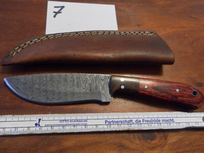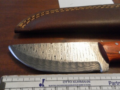 Ich verkaufe aus meiner Sammlung ein schönes und absolut neuwertiges Damast Jagd - oder Campingmesser. Es besteht aus 1095&15N20 er Stahl und ist handgeschmiedet. Es ist Gesamt 20,0 cmm lang und die Klinge beträgt 10,5 cm. Der Griff besteht aus Holz. Dazu gehört eine Lederscheide.