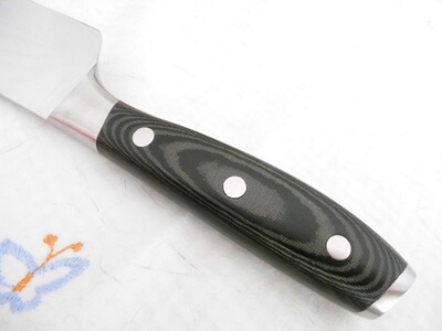 ergonomisch geformter One Touch Griff aus hochwertigem, geschliffenen, polierertem, wiederstandsfähigem schwarzen MICATA Messergriff, dreifach genietet;