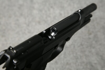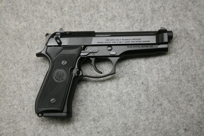 Kaliber 9 mm Luger. Zivil-Ausführung der langjährigen US-Dienstpistole. Verschluß aus Stahl, Griffstück aus Leichtmetall. Lauflänge 125 mm, Gewicht ca. 975 g, Magazinkapazität 15 Patronen, mit Reservemagazin und Beretta Kunststoff-Koffer.