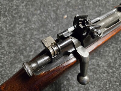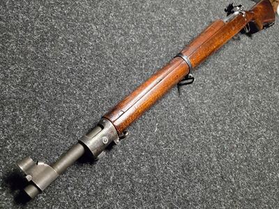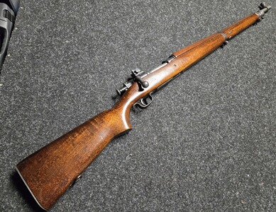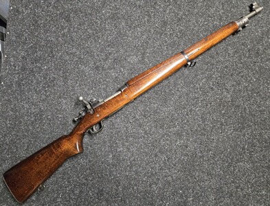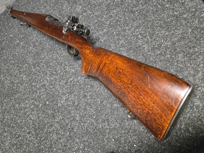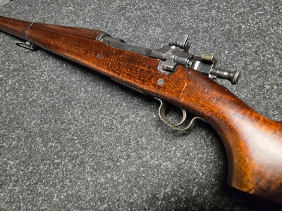 Seit jeher gilt der Springfield M 1903 besonders in der A3 Version als eines der besten Ordinnanzgewehre. Zu Recht! Die Waffe verwendet einen Verschluss nach der Art Mauser 98 mit kleinen Abänderungen, oftmal nicht zum Nachteil! Der 1903A3 wurde vorwiegend von Remington Arms und Smith-Corona produziert, es sollen um 700.000 Remington und 300.000 Smith-Corona hergestellt worden sein, im Vergleich zum K98k ist das wenig! Der A3 mit dem C.Schaft ist besonders beliebt, weil er eine sehr präzise Visierung mit dem auenfreundlichen und regelkonformen Dioptervisier mit einer Seitenverstellung verbindet. Die Visierlinie ist lang, der lange Schaft unterdrückt das löstige Flimmern. Der C-Schaft aus bestem Walnußholz schießt sich komfortabel und ist ergonimisch top. Es ist erstaunlich, wie sanft sich eine so potente Patrone wie die .30-06 aus dem M1903A3 schießen lässt, kein Vergleich zum Tritt eines 98ers. Die Vorliegende Waffe ist eine Reoetierbüchse mit einem 5-schüssigen Mittelschaftmagazin. Der stabile Verschluss arbeitet geschmeidig. Lauflänge: ca. 61 cm (24 Zoll), Gewicht: ca. 3,9 kg (8 lbs 11 oz), Gesamtlänge: ca. 110 cm (43,2 Zoll).