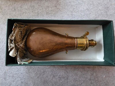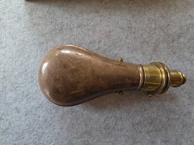 Verkaufe hier zur Verkleinerung meiner Sammlung eine schöne Pulverflasche aus Kupfer für Vorderladerwaffen.