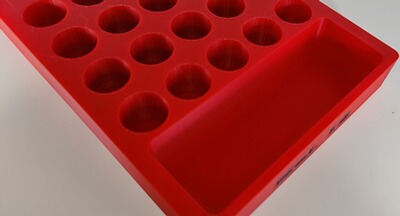 Es ist 3d gedruckt aus rotem PLA mit schwarzer Schrift.