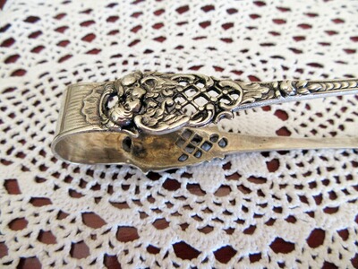 Reich verzierte aus 800er Silber gefertigte Zuckerzange im Stil des Biedermeier. Reichhaltige plastische Verzierungen am Handhaben mit zwei herzallerliebste, sich kosende Putto. Die Handhaben enden in zwei plastisch geformte Greifflächen die in Form von Adler- oder Greifklauen gehalten sind. Am Bügel der Handhaben befindet sich die deutsche Punze Halbmond, Krone und 800 sowie die Herstellerpunze der Silbermanufaktur Ludwig Kramer.