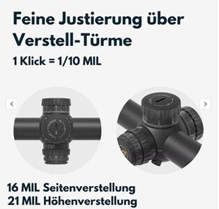 - Verstellung: 1/10 MIL, 1cm, 0.1 MRAD