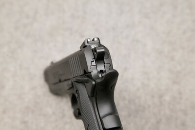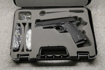 Kaliber .45 Auto (.45 ACP). Brüniert, Lauflänge 4,25" / 10,8 cm, Ganzstahlwaffe. 3-Dot Novak-Visierung, verlängerte Daumensicherung links, Ringhammer, verlängertes Beavertail. Single-Action-Abzug. Magazinkapazität 8 Patronen. Double-Diamond Kunststoffgriffschalen mit Fischhaut. Gewicht 1.080 g. Mit Koffer.