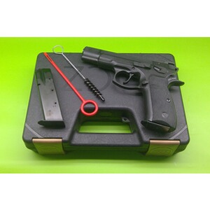 Selbstladepistole CZ 75 B Omega, Kaliber 9mm Luger, gebraucht, brüniert, offene 3-Dot-Visierung, Lauflänge 114 mm, Gummigriffschalen, 2xMagazine mit jeweils 16 Schuss Kapazität, linksseitiger Magazinauswurfknopf, beidseitig bedienbarer Entspann Hebel, dazu originaler CZ-Koffer mit 2 Reinigungsutensilien