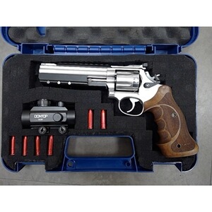 Revolver Smith&Wesson 686-2 Stainless mit Holzgriffschale, Kal.: .357 Magnum, Laufgewicht, Picatinny-Schiene, verstellbare Kontrastvisierung, Rotpunktzielgerät Dontop 1x30, Pufferpatronen, Originalkoffer, sehr guter Zustand