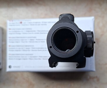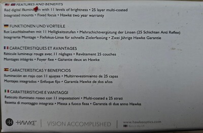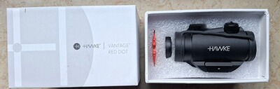 Biete mein Red Dot das Hawke Vantage Reflex-Visier 1x20 inkl. Montage für Weaver und/oder Picatinny an. Ist ein sehr scharfer roter Leuchtpunkt mit 3 MOA und 11stufiger Helligkeitsregelung, lässt sich nur etwas schlecht fotografieren. Feste Parallaxekorrektur ab 9Meter und 25fache Mehrschichtvergütung sowie Stickstofffüllung. Ist in sehr gutem Zustand, war auf der weing genutzten Marlin UHR auf der Picatinnyschiene montiert. Die Marlin ist nun verkauft und ich habe noch ein zweites auf dem KK-UHR. Deswegen nun der Verkauf, der Lieferumfang siehe originale Fotos - alles in OVP.