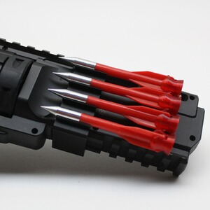 Arrow S2, leichte Bolzen aus Kunststoff mit Metallspitze und einem Gewicht von ca. 6,3g je Stück, diese auch gut in der 7,5 Joule Version verwendbar. Diese Pfeile werden von vorne geladen, das Magazin sollte dabei eingesetzt, aber leer sein. Dieses Modell mit einem Schaft aus Kunststoff besitzt den Vorteil, daß es sich nicht so leicht verbiegt wie vergleichbare Schäfte aus Aluminium und sind bei Beschuss auf eine weiche Pfeilfangmatte oft wiederverwendbar.