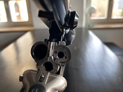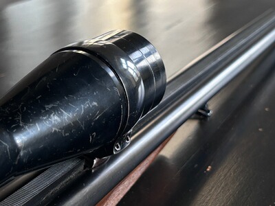 Der Drilling besitzt einen langen, jedoch nicht Mündungslangen Einstecklauf in Kaliber .22WM. Es sind diverse Gebrauchsspuren, hauptsächlich am Glas vorhanden, die Funktion ist allerdings Krieghoff typisch hervorragend.