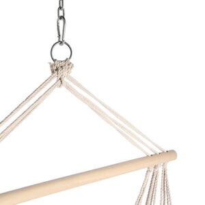 Der Stoff des Hängesessels NC3101 fühlt sich gut an. Der Sessel ist aus einem atmungsaktiven TC-Material hergestellt, das gleichzeitig sehr haltbar, witterungsbeständig und abriebfest ist. In Kombination mit den dick gewebten, festen Seilen, einer massiven Holzstange und einem Metallring beträgt die maximale Belastbarkeit des Hängesessels 120 kg. Die Gesamtheit all dieser Faktoren ist nicht nur ein Zeichen der Widerstandsfähigkeit und Sicherheit, sondern vor allem der Bequemlichkeit und des Benutzungskomforts.