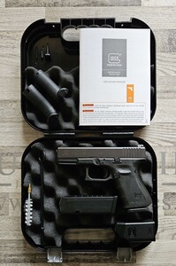 Neuwaffe im original Glock Pistolenkoffer, inklusive 2 Stück 15-Schuss Magazinen, Ladehilfe, austauschbare Griffrücken, Putzstock, Zubehör gemäß Abbildung, Bedienungsanleitung