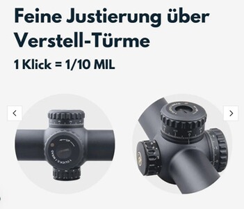 Zu den bemerkenswertesten Eigenschaften dieses Zielfernrohrs gehören das beleuchtete Absehen mit 6 Stufen welches der Umgebungshelligkeit angepasst werden kann um das Ziel schnell zu erfassen und die feine Verstellung in 1/10MIL Schritten. Dies ermöglicht eine bessere Sichtbarkeit des Absehens bei schlechten Lichtverhältnissen oder in der Dämmerung und eine feine Anpassung der Zielgenauigkeit um das Zielfernrohr optimal in Ihre individuellen bedürfnisse und Schießbedingungen anzupassen.