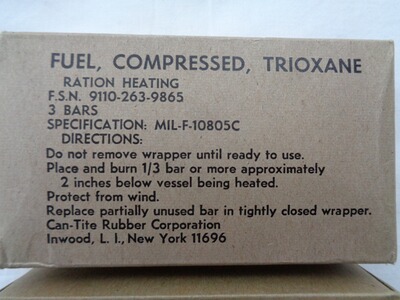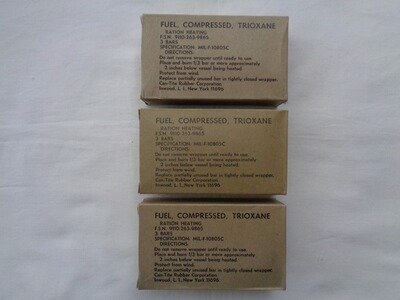 Verkaufe aus meiner privaten Sammlung ein Set mit drei Stück original US-ARMY Kartons mit Trioxane Trockenbrennstoff, Baujahr 1970, in unbenutztem Zustand (NOS).