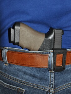 einfaches aber effektives Hosenbundholster zum verdeckten Tragen von full-size und semi-compact 9 mm Pistolen. Passend z. B. für Glock 17 und 19, H&K USP, Walther P99 u.s.w.