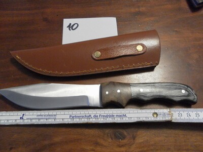 Ich verkaufe aus meiner Sammlung ein schönes und absolut neuwertiges Jagd - oder Campingmesser im Bowie Style. Es besteht aus 1095 er Kohlenstoffstahl. Es ist Gesamt 26,00 cmm lang und die Klinge beträgt 13,5 cm. Der Griff besteht aus 2 Sorten Holz. Dazu gehört eine Lederscheide.