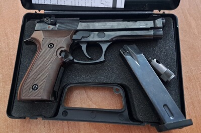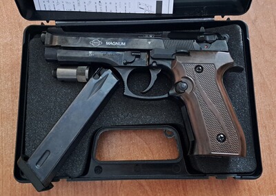 Zum Verkauf eine Ekol Firat Magnum im Kal. 9 mm Knall, diese ist die zur Zeit detailgetreueste Nachbildung der Beretta 92 FS auf dem Markt für freie Waffen. Es wurde sogar die originale Magazinkapazität von 15 Patronen übernommen. Durch die 2-reihige Magazinausführung liegt die Pistole gut in der Hand. An dieser Waffe wurden zudem Auszieher, Schlagbolzen und Magazingehäuse aus Stahl gefertigt.