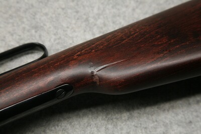 Es handelt sich um ungeschossene, unbenutzte Unterhebel-Repetierbüchsen mit äusseren Transportschäden. Die Bilder zeigen beispielhaft typische Fehler.