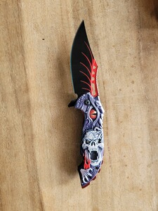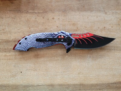 Dieses Taschenmesser ist ein echter Blickfang. Sowohl der Griff, als auch die Klinge sind reich verziert. Auf dem Griff ist die Verzierung in 3D. Auf der Rückseite befindet sich ein Gürtelclip.