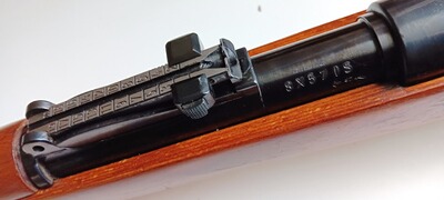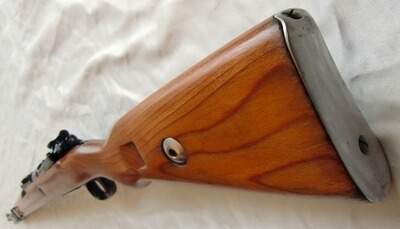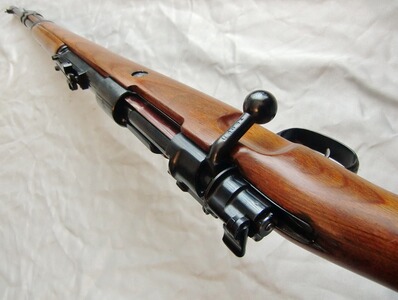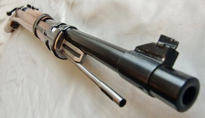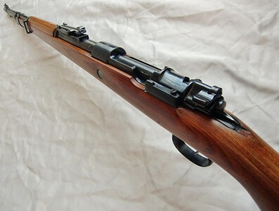 Hier handelt es sich um einen K98, ursprünglich aus Steyr-Fertigung, der in Jugoslawien kompl. überarbeitet wurde. Die ursprüngliche Stempelung bnz 42 ist noch ganz schwach auf dem Hülsenkopf erkennbar.