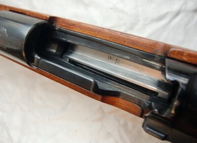 Kal. 8x57IS, EINZELLADER!!! (Älterer Umbau zum Einzellader mittels 2 Stahlstiften im Magazinschacht. Zubringer und Feder sind noch vorhanden). Rückbau zum Mehrlader sollte für einen Büma kein Problem sein.