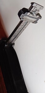 Das Kimmenblatt wurde vom Vorbesitzer auf der Unterseite etwas abgeschliffen und nachträglich mit einer Stellschraube versehen, die mittels einer seitlich angebrachten Madenschraube fixiert werden kann. Feinvisier Marke Eigenbau so zu sagen.