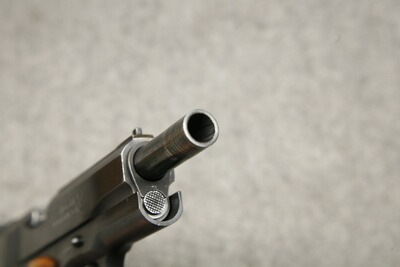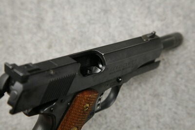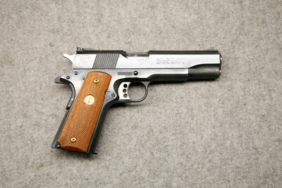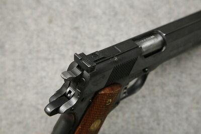 Kaliber .45 ACP (.45 Auto). Lauflänge 5" / 127 mm, Ganzstahlwaffe. Fein einstellbare Colt Elliason Mikrometer-Visierung. Single-Action-Matchabzug, Triggerstop-Schraube fehlt. Langer Schlittenfanghebel. Holzgriffschalen mit Fischhaut, ein Magazin für 7 Patronen.