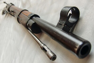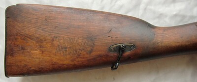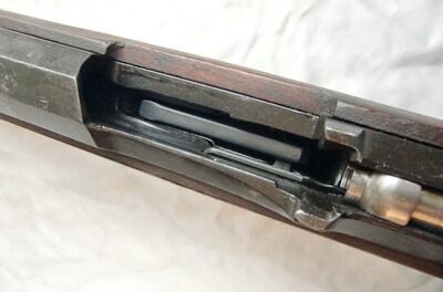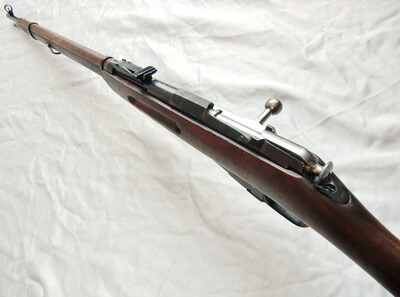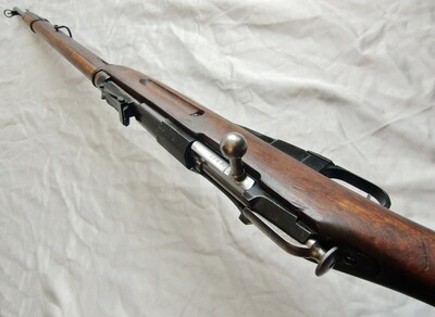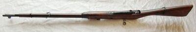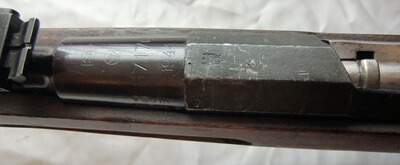 Kal. 7,62x54R, brüniert, eckige Systemhülse, EINZELLADER!!! (Älterer Umbau zum Einzellader mittels Stahlstiften im Magazinschacht. Zubringer und Feder sind noch vorhanden). Rückbau zum Mehrlader sollte für einen Büma kein Problem sein., gerader Kammerstängel, unblockierte Schiebevisierung bis 2000m, Korntunnel, incl. Putzstock. Gerader Holzschaft mit Metall-Schaftkappe und Riemenbügeln.