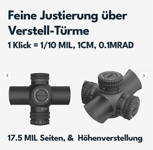- Verstellung: 1/10MIL, 1cm, 0,1MRAD