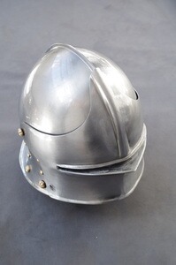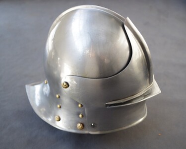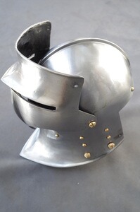 Diese sehr originalgetreue Rekonstruktion eines deutschen Schallers verbindet sowohl authentische Darstellung als auch große Sicherheit beim Schaukampf. Das Visier ist durch einen angebrachten Dorn in der untersten Stufe arretierbar. Der Helm hat ein sehr komfortables Lederinlay und einen soliden Kinnriemen mit Schnalle.