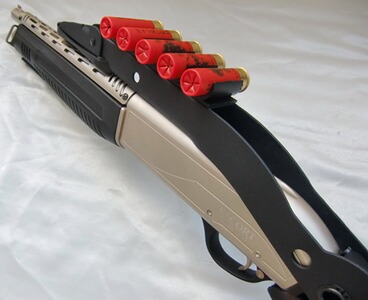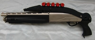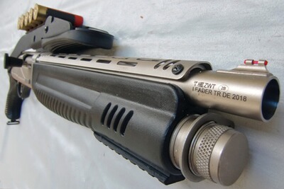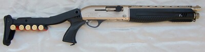ESCORT Auto Defend TFS Selbstladefline. Made by Hatsan Arms mit „Smart Valve Piston“-System, das eine sichere Funktion unter jeder Bedingung gewährleistet, Kal. 12/76, 5-Schüssig, Finish: Nickel und mattschwarz, Hartanodisierter Systemkasten, Hitzeschild auf dem Lauf, Überklappschaft mit Pistolengriff und Patronenhalter für 5 Patr., Druckknopfsicherung, Magazinsperre, ohne Choke - Zylinder, Lichtsammelkorn, 11mm Prismenschiene auf dem Systemkasten, Riemenbügel, Picatinnyschiene unten am Vorderschaft, Das Röhrenmagazin kann durch beiliegende Magazinsperre schnell auf 2 Patr. begrenzt werden